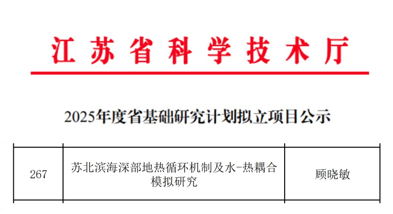 近日,江苏省科学技术厅公布了2025年度江苏省基础研究计划评审结果,我中心教师顾晓敏博士申报的《苏北滨海深部地热循环机制及水-热耦合模拟研究》项目获得自然科学基金(青年基金项目)资助,取得新的突破。